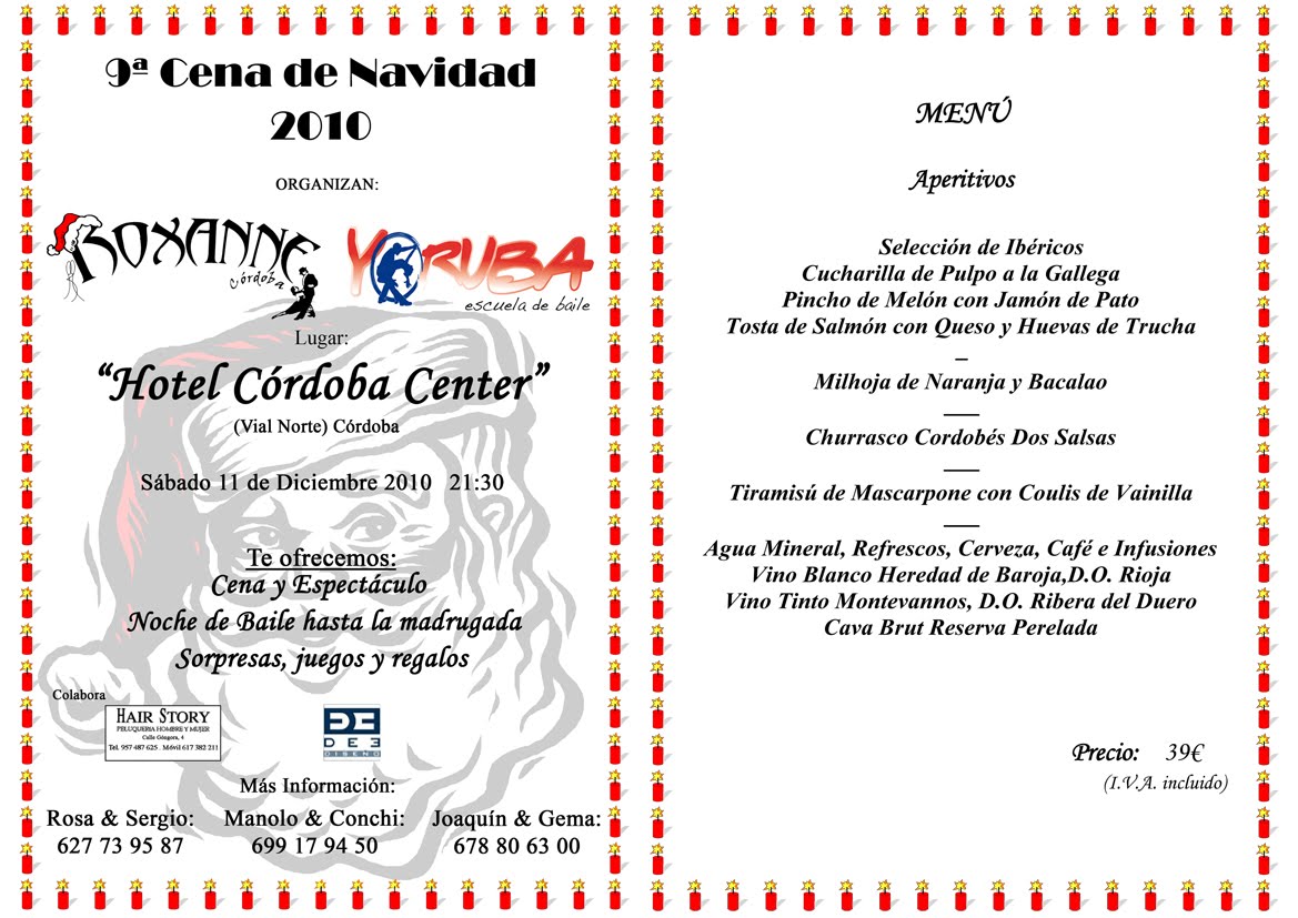 La cena de Navidad fue un éxito arroyador. Nos juntamos 168 personas comiendo, bebiendo y sin parar de bailar. Todo fue genial: desde el espectáculo hasta la fiesta de baile tras la cena, el cual duró hasta las 5:30 de la mañana (porque quité la música, sino estamos allí todavía) :)Queremos agradeceros vuestra asistencia otro año más. También queremos agradecer al centro de formación D3Diseño su colaboración, así como a todo el personal de Hotel Córdoba Center su colaboración en todo momento: director, comerciales, recepcionistas, mantenimiento, camareros, etc, en fin a todo el personal por la labor llevada a cabo.En cuanto consiga que el ordenador me haga caso, ya colgaré el video resumen del espectáculo y de la fiesta. Enhorabuena a todos los ganadores de los concursos: los ganadores del baile del limón, del baile de la escoba, a los que se llevaron los lotes y a los que se llevaron la cesta. Un poco más y sorteamos también los cuadros de hotel: !Cuánto regalo!